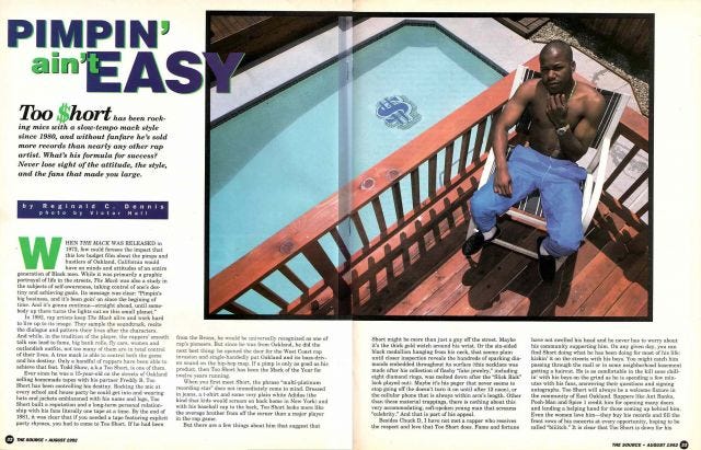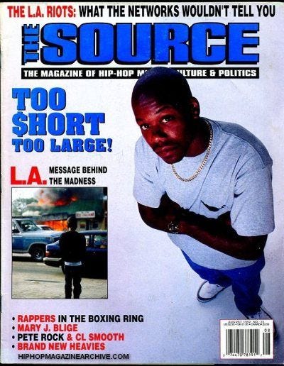 Kristin Corry 还提到了一个这期杂志的牛逼之处,就是这期的封面是 Too $hort, 并且还有 Reginald Dennis 对 Too $hort 的专访。说到这就想把 Kristin 文章的整段来引用: “When the LA riots story came out that August, The Source staffers chose Too $hort as their cover star—not because he was more important than the state of Black America, but because The Source was one of the few outlets that would give him a cover. Their decision to run a profile about a rapper who glorified Oakland's pimp culture alongside their coverage of the rebellion wasn't an attempt to have the most salacious cover. It was a decision to honor the complexities of Black Americans: Celebrating Too $hort, a man whose joyful party music didn't preclude him from being painfully aware of the commodification of Black people in the industry, while paying respect to a community fed up with being treated like second class citizens.”